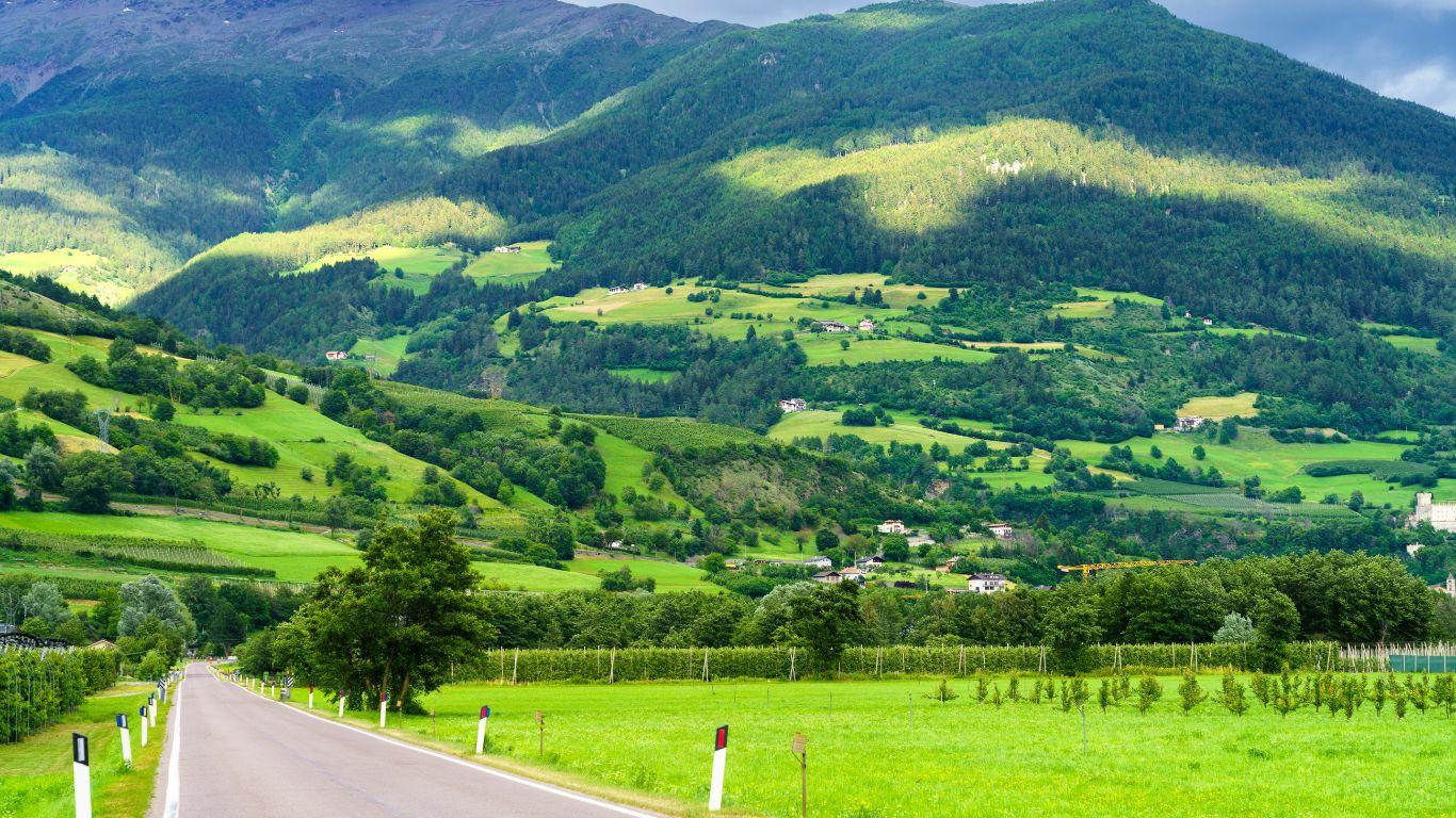 Si continua pedalando tra prati e campi di cereali, a circa mille metri di altitudine, in un paesaggio unico nell’arco alpino, reso speciale da un microclima fresco e asciutto che regala colori intensi e orizzonti limpidi.